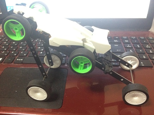 ミニ四駆漫画『二ツ星動力研究所』でも取り上げられた『ドノウシステム』。土嚢のように、細かい重りを入れたケースをマシンに搭載する事で、着地時のショック吸収をするというシステムです