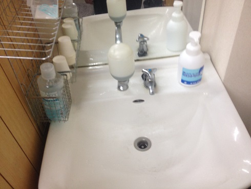 券売機の横にはトイレと洗面所があり、洗面所にはうがい薬や歯磨き用品が備え付けられいます