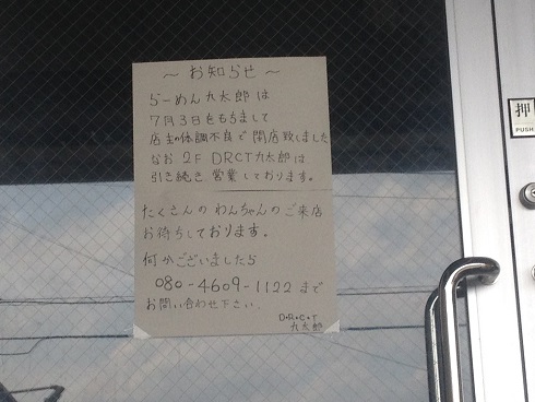 ラーメン九太郎 閉店のお知らせ コメントを残す Tweet Pocket 柿生のキレイなラーメン屋さん、ラーメン九太郎ですが 7月3日より、店長の体調不良で一時閉店しているようです 一刻も早い回復と開店をお待ちしています!!