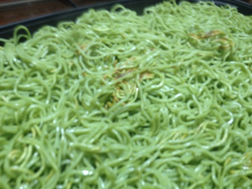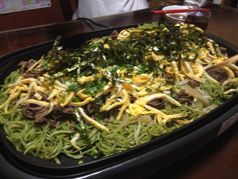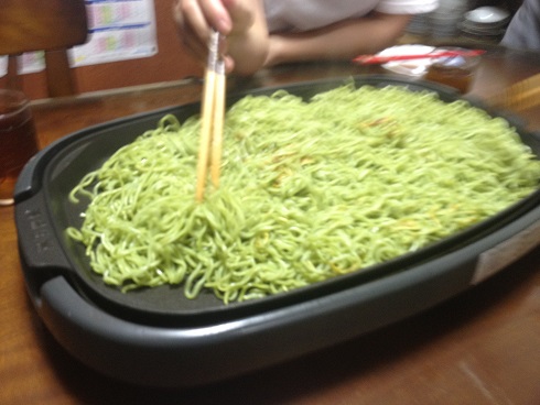 緑色の麺!?これが本当の瓦そばだ!! コメントを残す Tweet Pocket つい半年前、瓦そばの記事を書きましたが あれは本来の麺の色じゃない! 本当の瓦そばは面が緑色なのです! 緑色のこの麺もしっかり焦げ目がつくまで焼きます これこそが真の焼きそばの証!! そこへ、既に炒めてある玉ねぎやもやし 錦糸玉子 焼肉 を一緒に鉄板の上へ 専用のつゆでいただきましょう 緑色の麺でも旨い!!