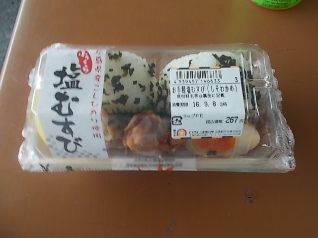 広島県産こしひかり使用 ふっくら塩むすび(しそわかめ) 食べてみた コメントを残す Tweet Pocket 山口から兵庫へ行く途中の、岩国駅で購入しました! 山口県でしそわかめと言えば きたなが~と~♪ 自然のめぐ~み~♪ くにちか~の~しそいりわ~か~め~♪ なCMを思い出しますが 多分それとは関係ない 塩むすびとわかめの塩加減が絶妙! 玉子にから揚げにと力が出るおかずもついているので、朝に食べると元気が出ます! 野菜は沢庵だけと言うのが寂しい