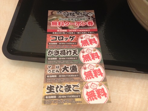 名代箱根そば 今なら無料クーポン券がついてます! コメントを残す Tweet Pocket 今、箱根そばで注文すると 一緒に無料クーポン券がついてきます! コロッケ かき揚げ天 大盛 生たまご が無料になります! 今だけ!!