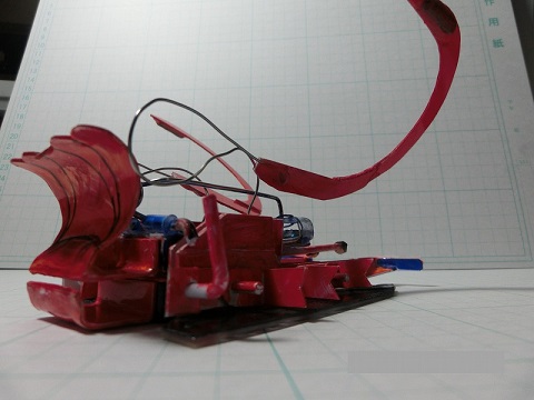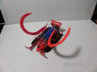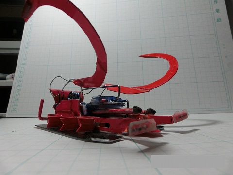 トリガーの横移動を上下の運動に変えるギミックで機体上部後方を上方へ押し上げてギミックを発動します、上部が丸ごと前方へ移動し、機体上部前方がバイザヘッド(機首が下がった状態)になるので上部に搭載した刺し込みブレードが相手機体とフィールドの隙間に差し込まれます(最初のハサミに衝撃が加わる時に相手