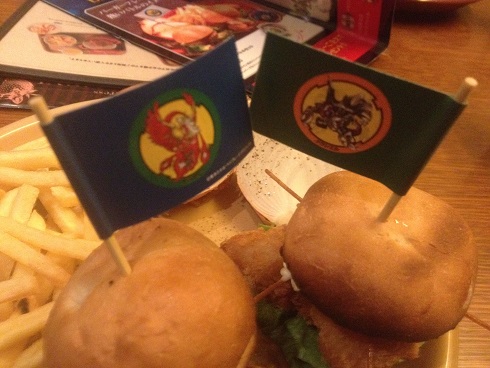 二つのハンバーガーには朱雀と玄武のビットの絵が描かれた旗が刺さっています