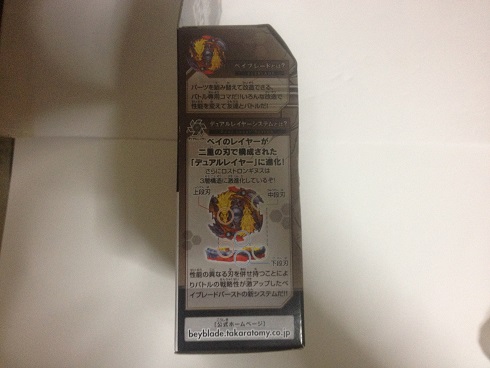 イベント限定 ロストロンギヌス.N.Sp金龍Ver. コメントを残す Tweet Pocket 次世代ワールドホビーフェアにて、購入しました! ・パッケージ ・中身 クリアブラックをベースに、メタルパーツが金になっています! エルドラゴゴールドバージョンを思い出しますね ・ランチャー ランチャーも特別カラー ・完成 渋い……! ・回転 ・使ってみて 通常版と比べてちょっとロックが緩い……? 試しにカイザーケルベウスと戦ってみたけど、ちょいちょいバースト負けする……