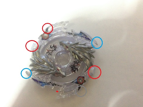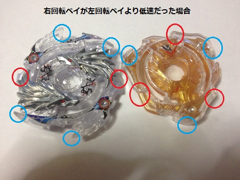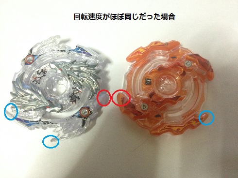 通常ベイブレードは、回転方向から見て刃の先端がぶつかり、刃の後方はぶつかりません