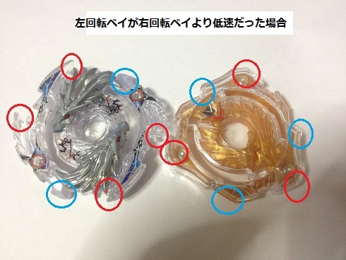 「低速状態で高速回転する右回転ベイと接触する事で、右回転ベイの回転を吸収しつつ、自分はバーストとは逆の方向に負荷を受け、右回転ベイは回転を与えつつ、自身の回転力によってバーストする方向に負荷を受けるが故に、高速回転側がバーストしてしまう」