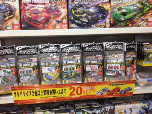 ちょっと強気な地元スーパーの玩具屋さん コメントを残す Tweet Pocket 地元のゆめタウン内にある玩具屋さん「ペリカン」に久しぶりに足を運んだのですが やはり、地元スーパーの玩具屋は展開の終わった商品を置いてくれるのでたまに見に行くと面白いものです しかし ゲキドライヴ……通常は定価だが、2個以上購入で20%OFF ガガンガン…定価 バトロボーグ4Gプッシュバロン…定価 ちょっと強気ですねぇ……! これで売り上げがあるのなら、嬉しい事ではありますが ちなみに、Gショットに関しては 本体一個にカスタマイズパーツが各種セットで1000円で売られてました CM