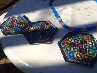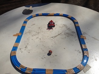 その後、また丸テーブルに戻って、プラレールをスタジアムにして平面フィールド操作式ベイブレードをプレイ