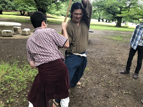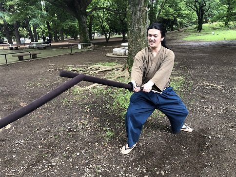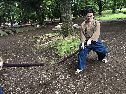 今回は、忍者・青龍窟さんが練習用のソフト刀や棒術を持ってきてくれたので