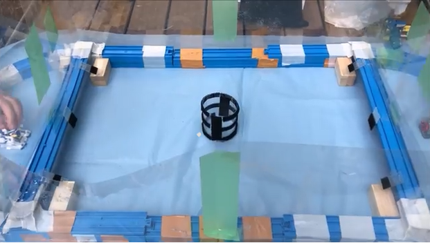 真ん中にセットしたパックの面ファスナーを先に相手のゴールの面ファスナーへ接触させた方の勝ち