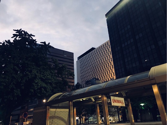 夜明けの名古屋のビル街を背に、新たな戦地へと旅立つのでした