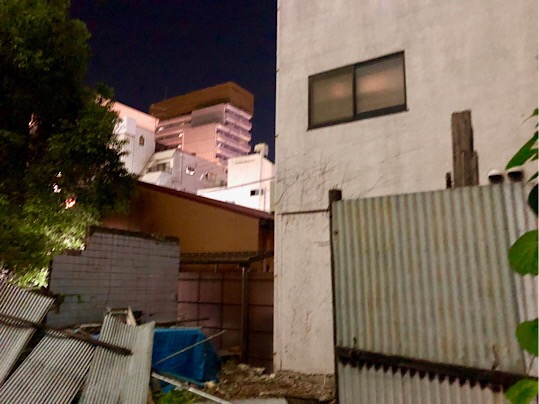 なんか、スパワールド前に焼けたビルがあるとかあって