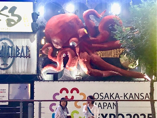 デッカいタコの看板のあるたこ焼き屋さんの前でガイドさんが何やら合図すると