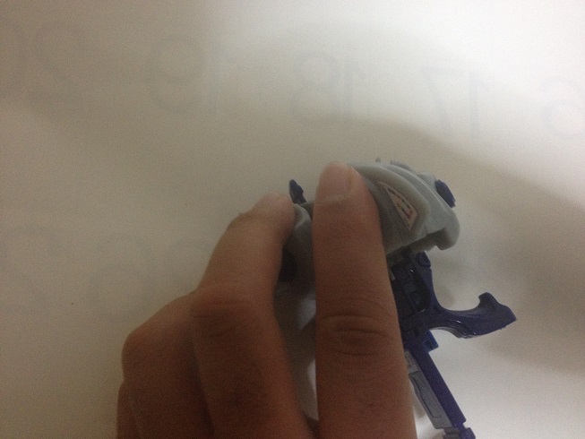 最大の特徴であるワンサイドコア。コア後部のウイングを人差し指と中指で保持することで片手撃ちが可能に