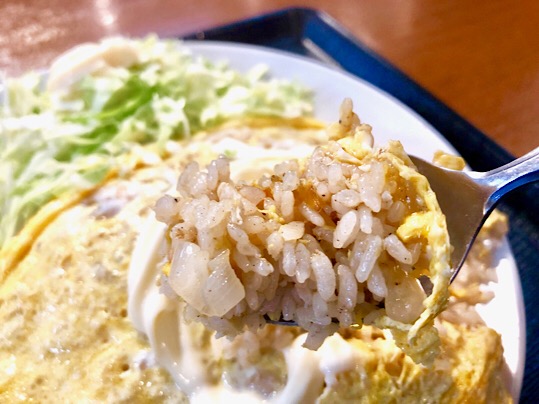 ケチャップではなくマヨネーズの乗ったオム卵の中にチャーハンがたっぷりと入ってます