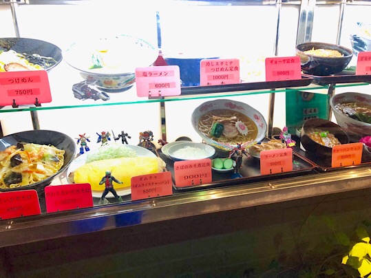 店舗前の商品サンプルには仮面ライダーのフィギュアが並べてあります