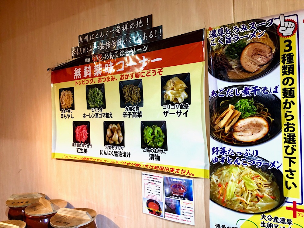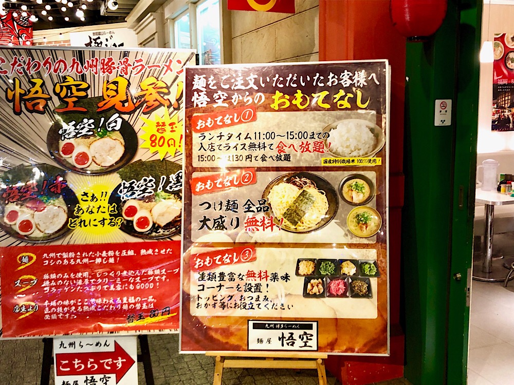 九州博多らーめん 麺屋悟空 行ってきた コメントを残す Tweet Pocket 立川のラーメンスクエアにあるラーメン屋です 15時までに行けばライス無料と超お得! とは言え、夜でもたったの130円でライスおかわり自由なのは十分お得ですね 無料薬味コーナー!ここがバイキングみたいで楽しい!! 辛もやしとホーレン草の胡麻和えが超美味い!! まずはライスを薬味でいただきます ご飯が進むわぁ これだけで満足度高い!! おお!!豚骨の博多ラーメン!硬さは粉落とし!!テンション上がるなぁ うおお、濃厚!硬い麺と合う!! CM