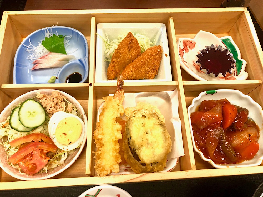 サラダ、刺身、天ぷら、酢豚、白身魚のフライ、ゼリー