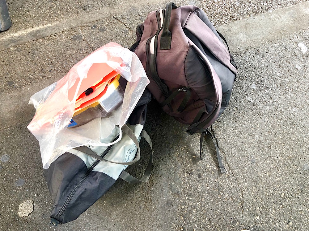 リュック背負って両手に手提げ袋と言うのはキツイ……