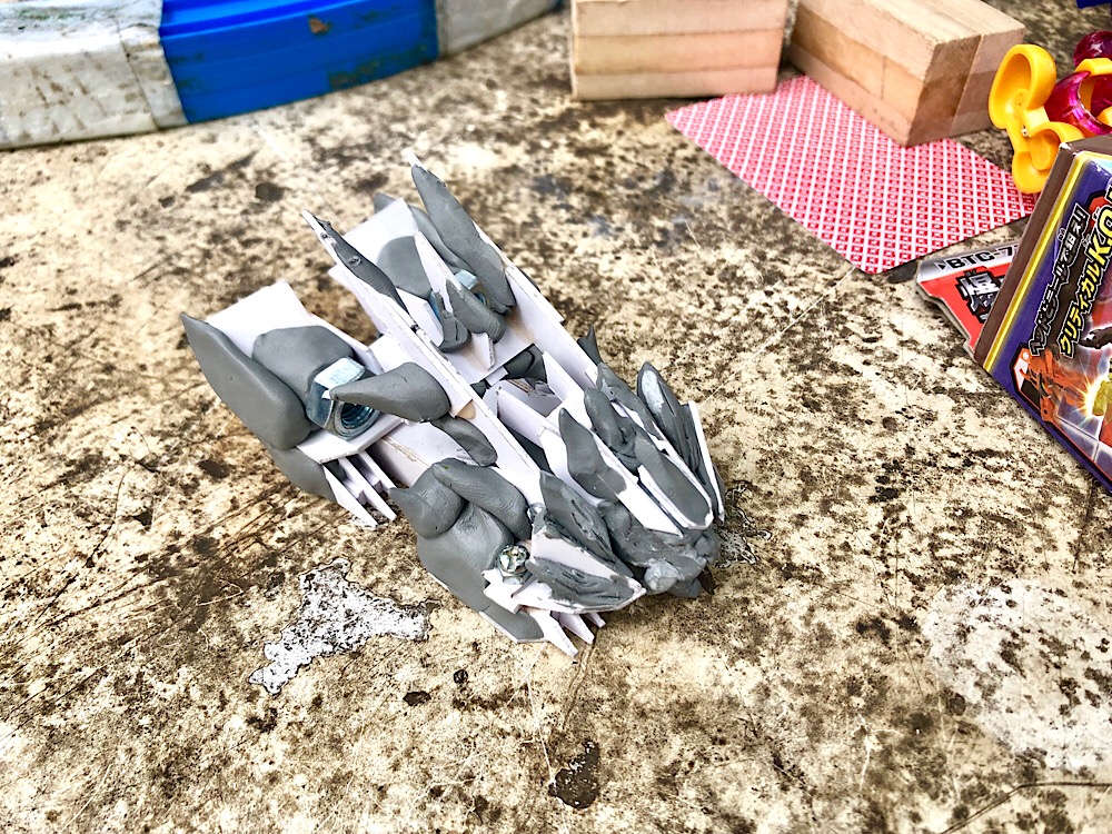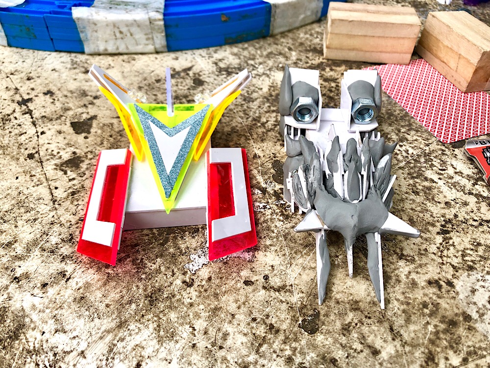 増税前最後の光が丘公園玩具会!その5 新機体!ワイルドガレオンvsレイコンデンサー コメントを残す Tweet Pocket その4はこちら カッコいいライオン型の造形をした機体を制作中のharrycsさん ほうじ茶さんがコミケ前に急遽作った見た目重視の機体レイコンデンサーとのツーショット お互い『見栄えのいいカッコイイ機体を作りたい』と言う目的は同じなのに こうも方向性が違う機体になっていくのは面白い! 早速、それぞれの考えるカッコイイ機体同士のバトル! 規定重量はクリアしてるものの、密度が高い故か体感重量が不思議と重いharrycsさんの新機体 体感重量はそのまま打撃力に直結するのか、見事なフリップアウトを決めた! つづく!