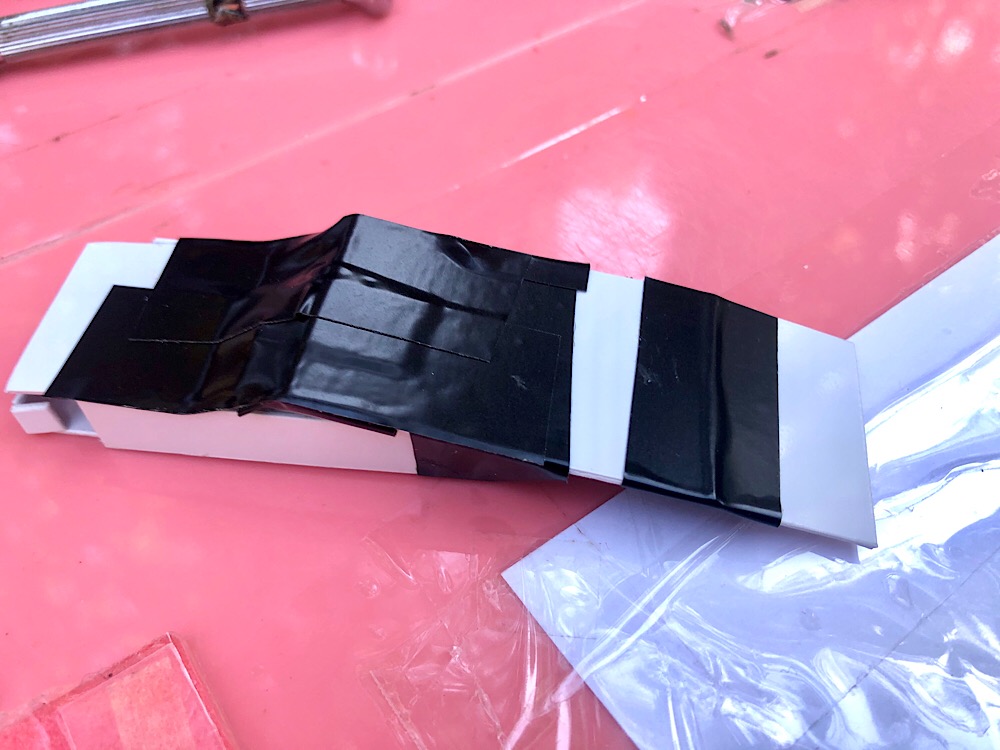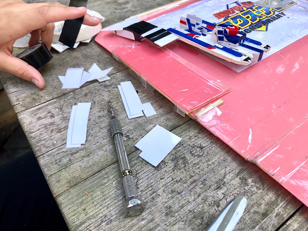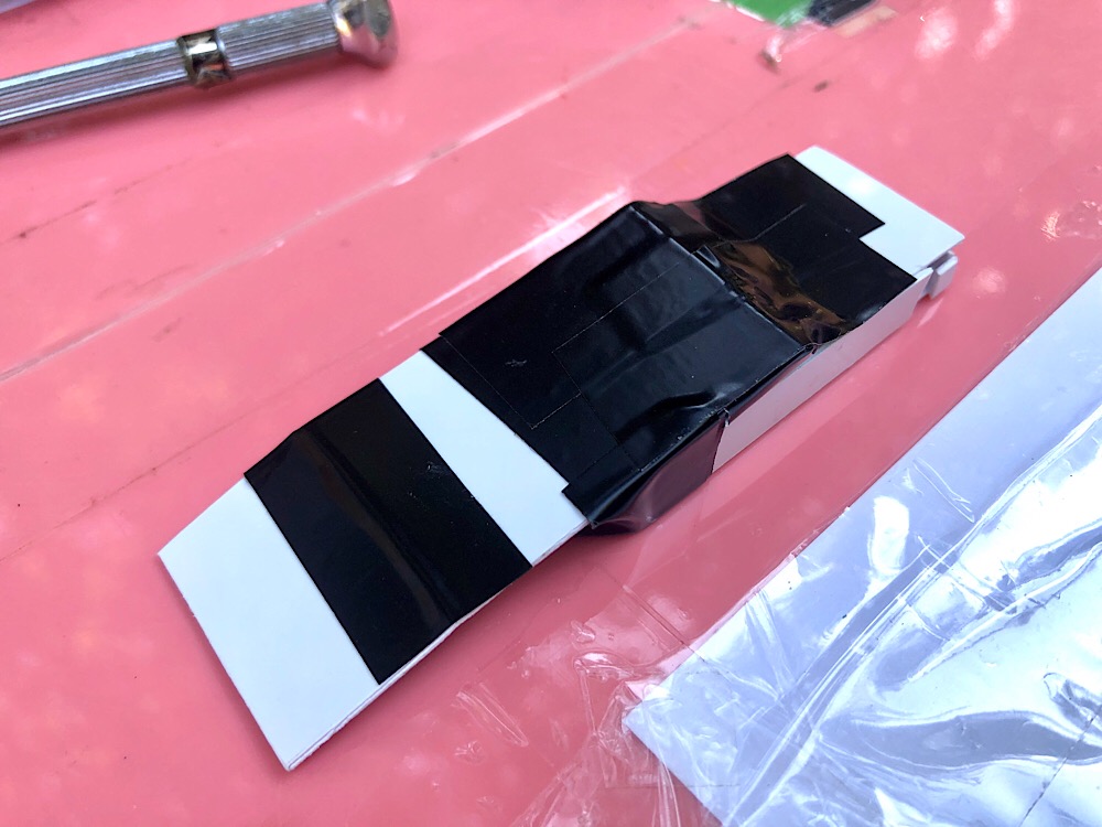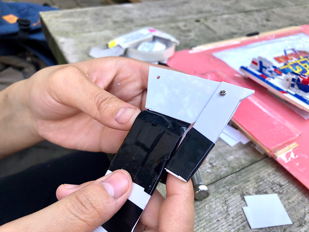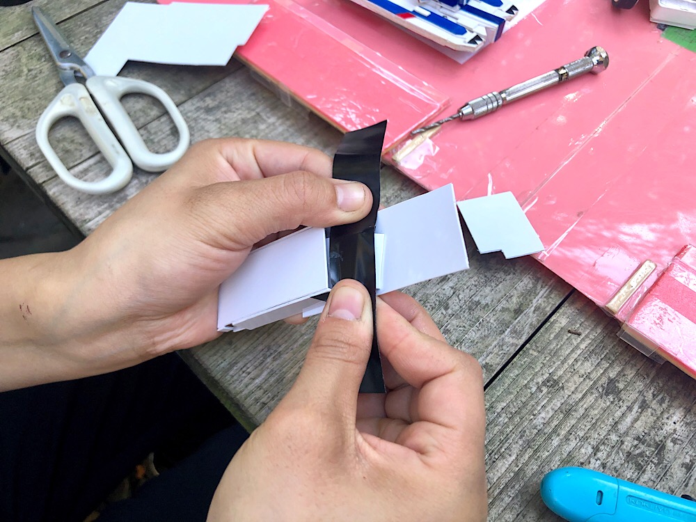 プラ板を曲げて、ビニールテープで補強し、ベースへ貼り付け始めた!!