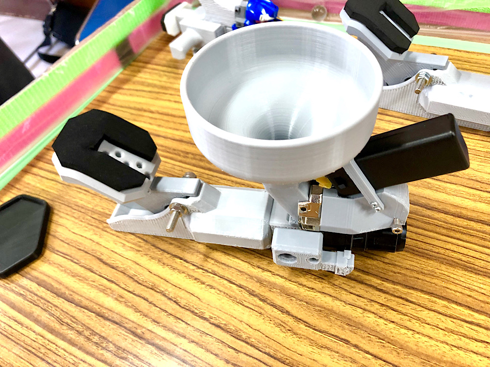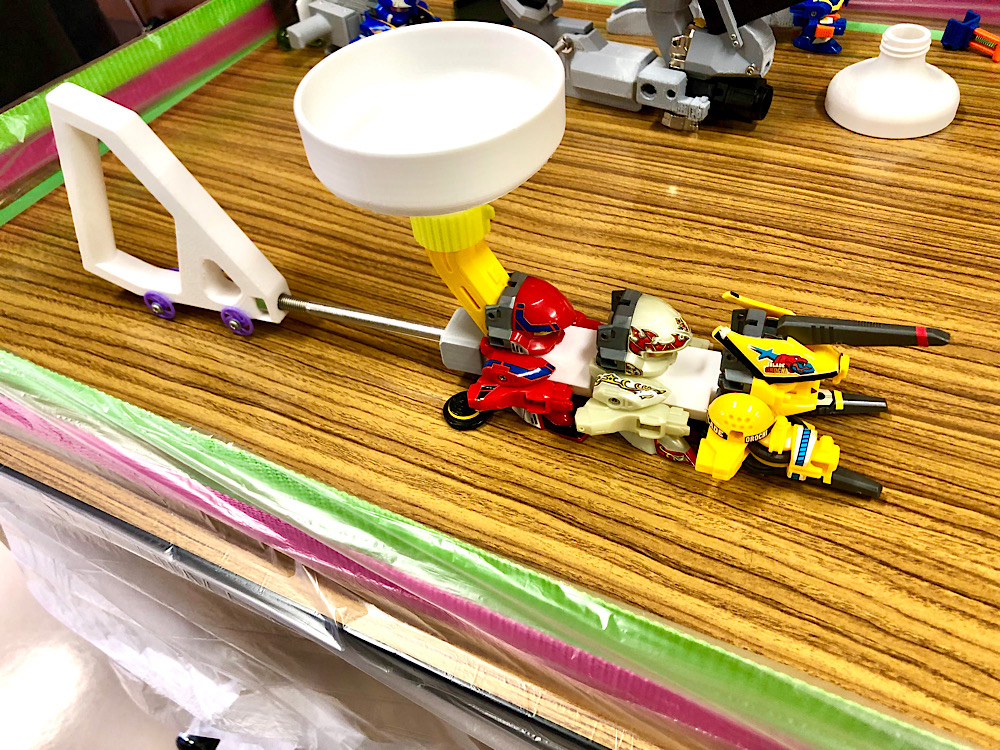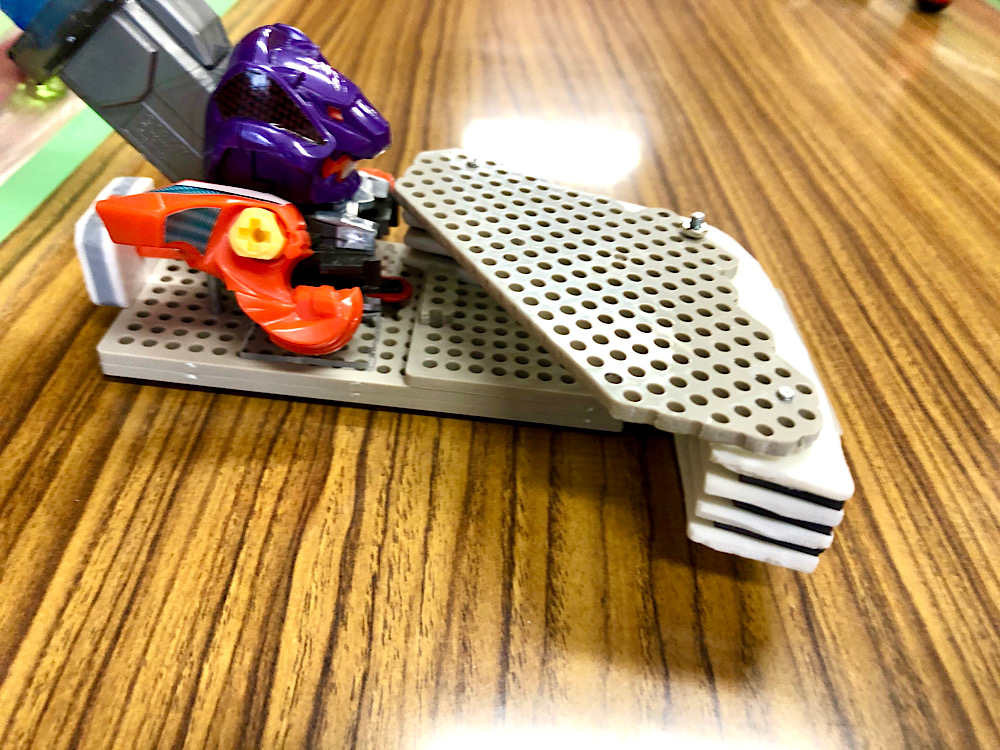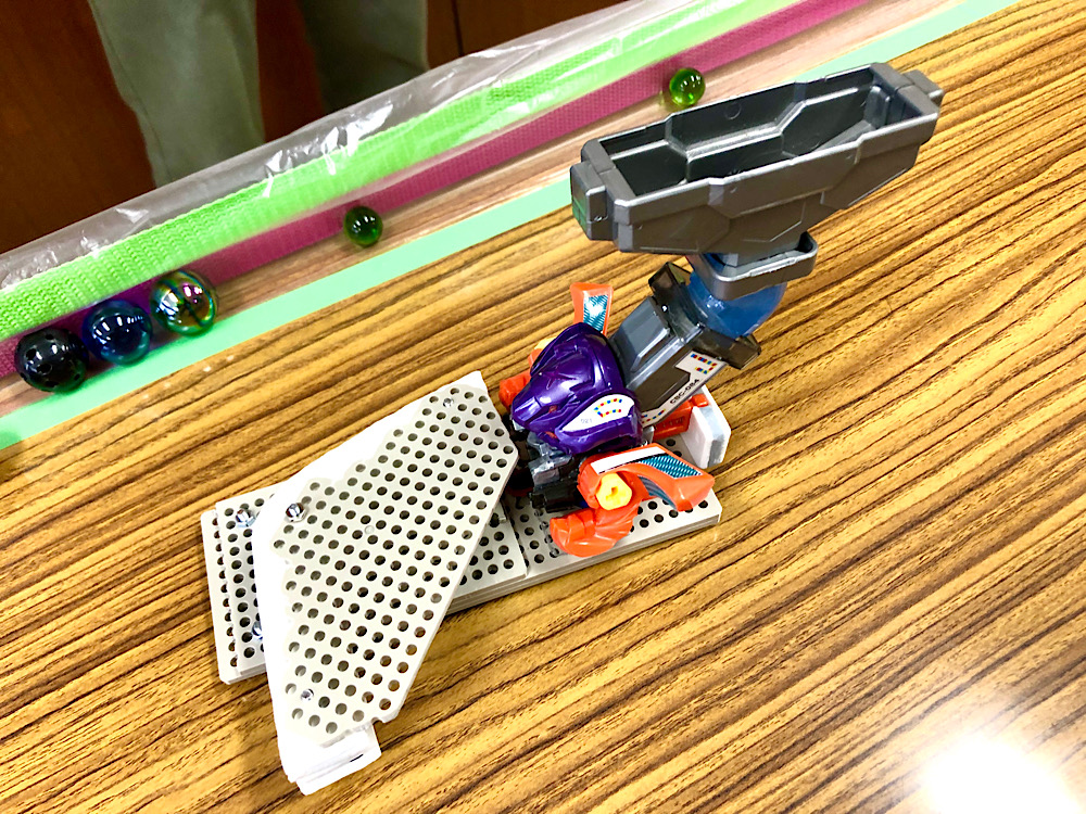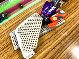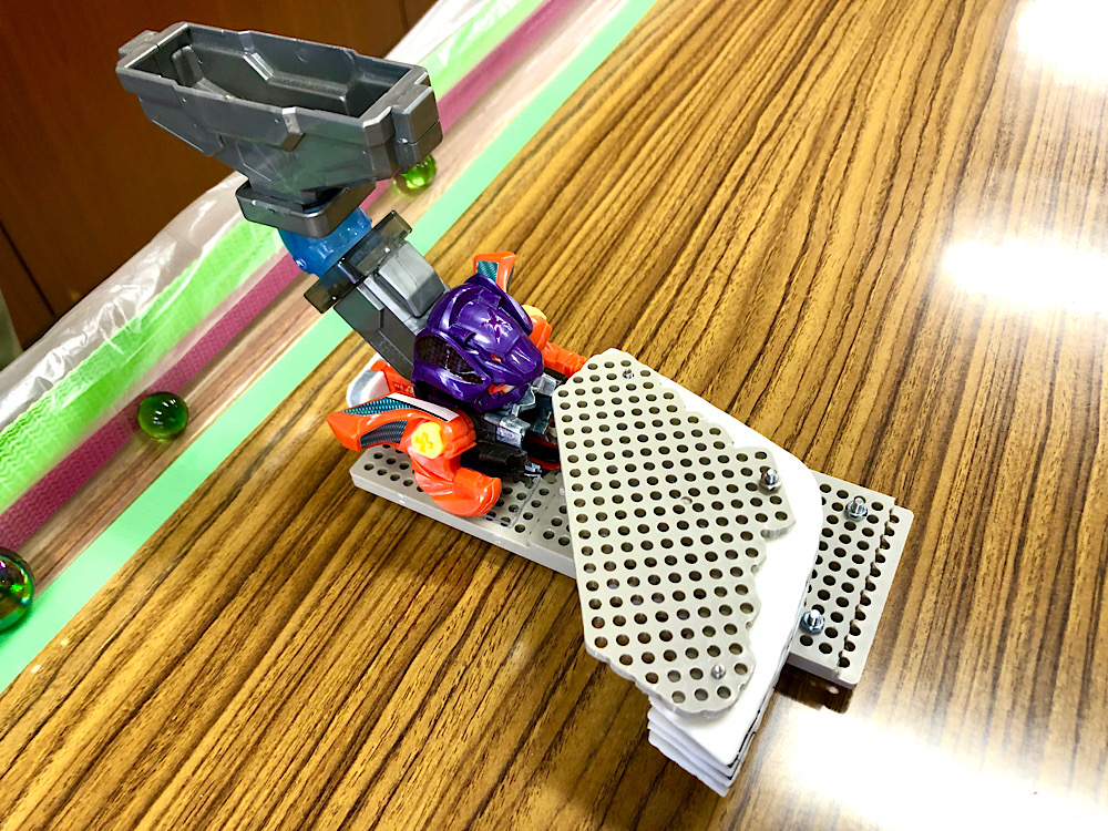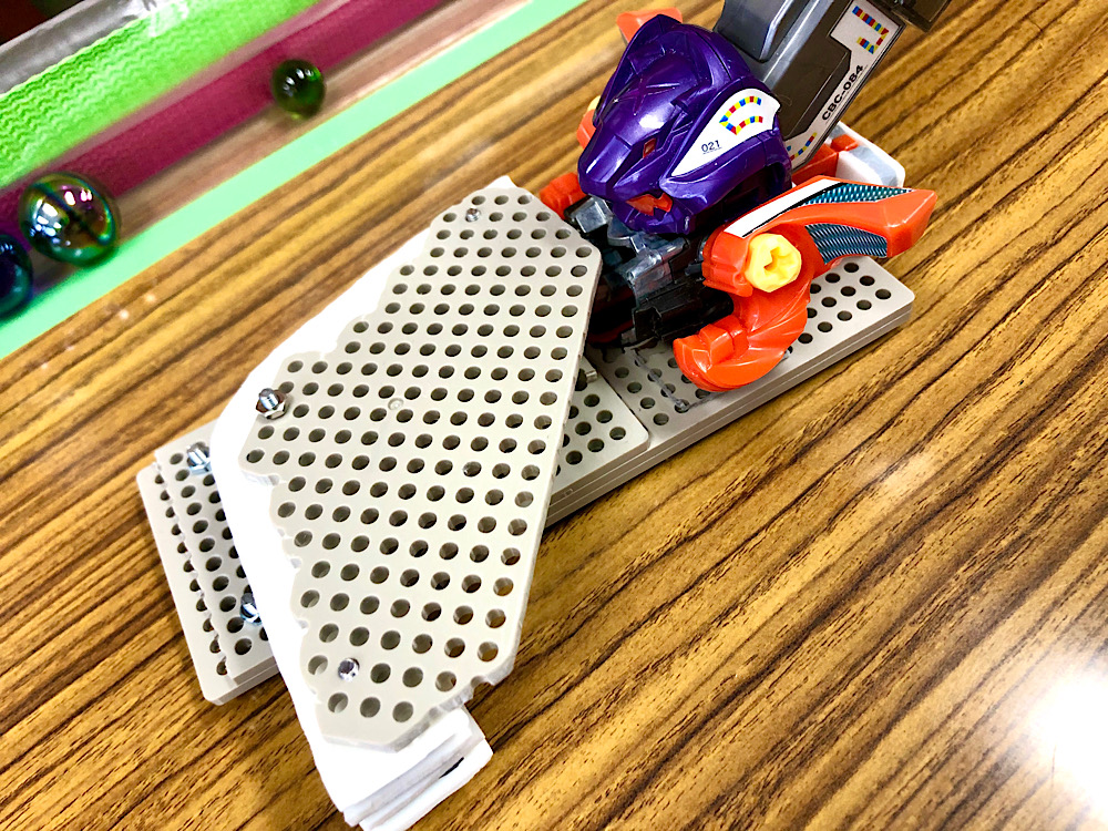 通常カーブショットは、上から落とされたスピンボールをスロープで前に出す事でビー玉に切り盛り回転を与えてカーブさせてるのですが