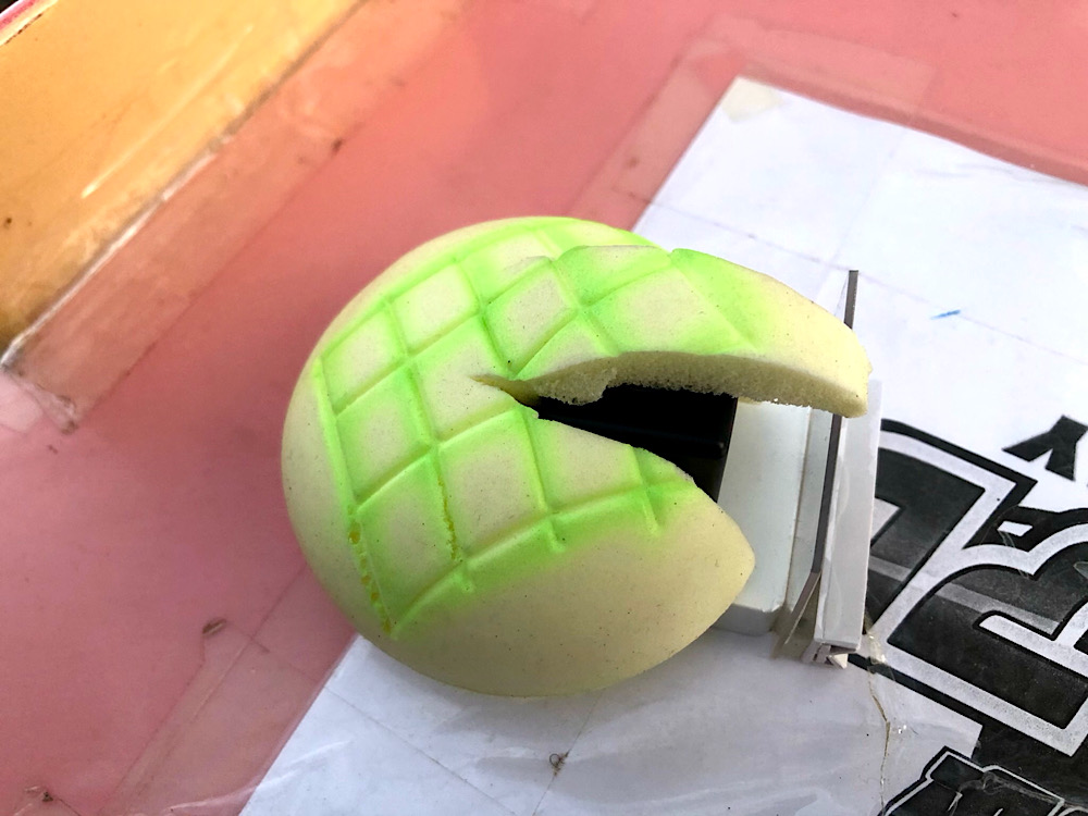 というのも、このメロンパンは重心が高いからすぐ転倒するため、撮影してもすぐに地面が映ってしまう