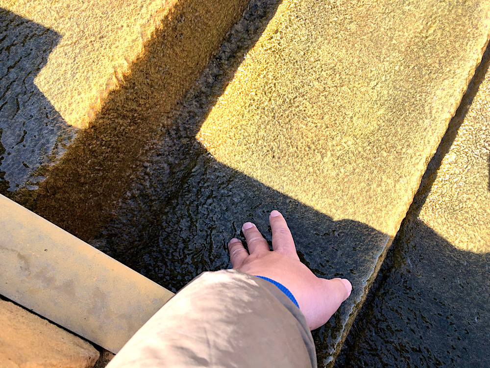 石段の中央には温泉が流れてます