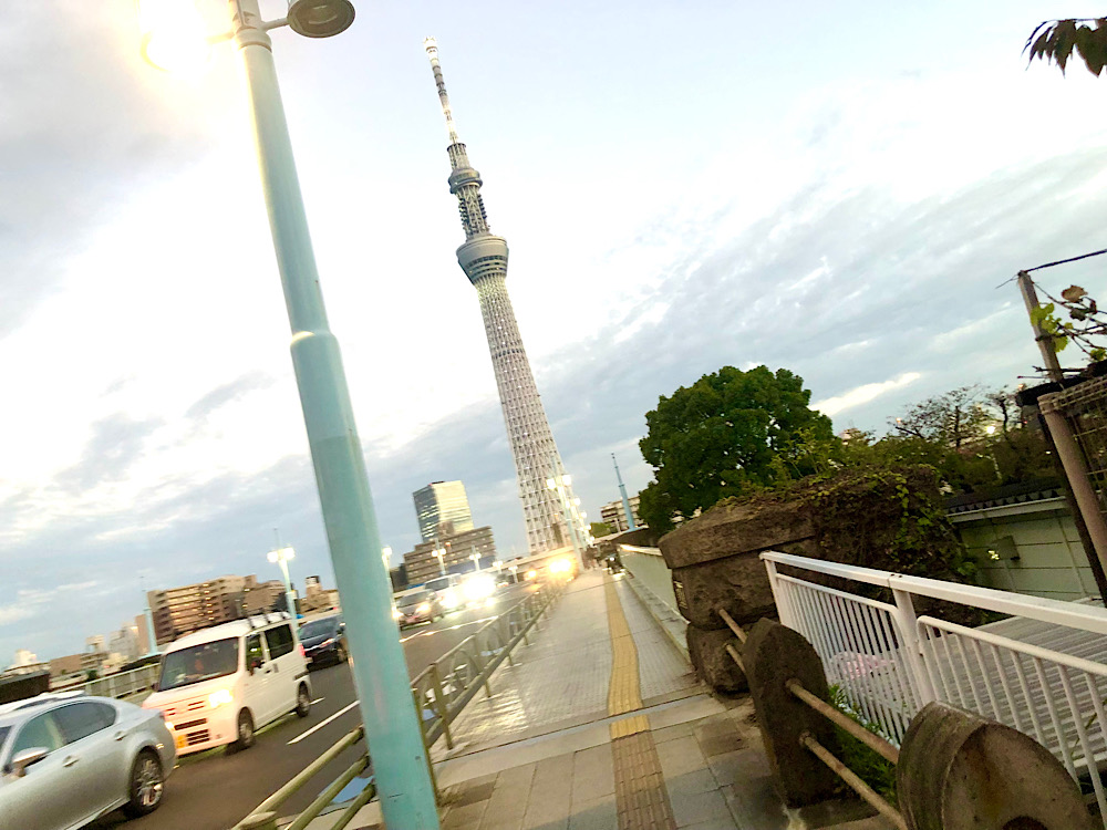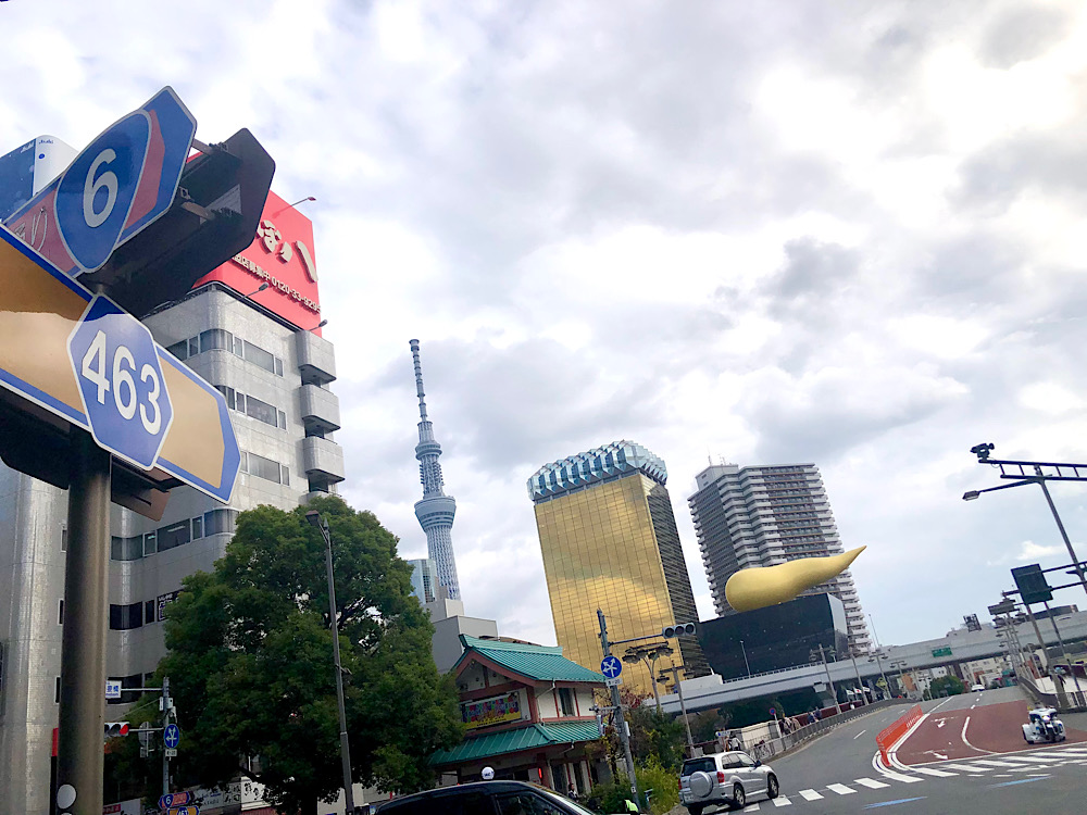 スカイツリーとアサヒ本社の炎が並び立つ風景が見られるこの交差点に来るとなんだかテンション上がります