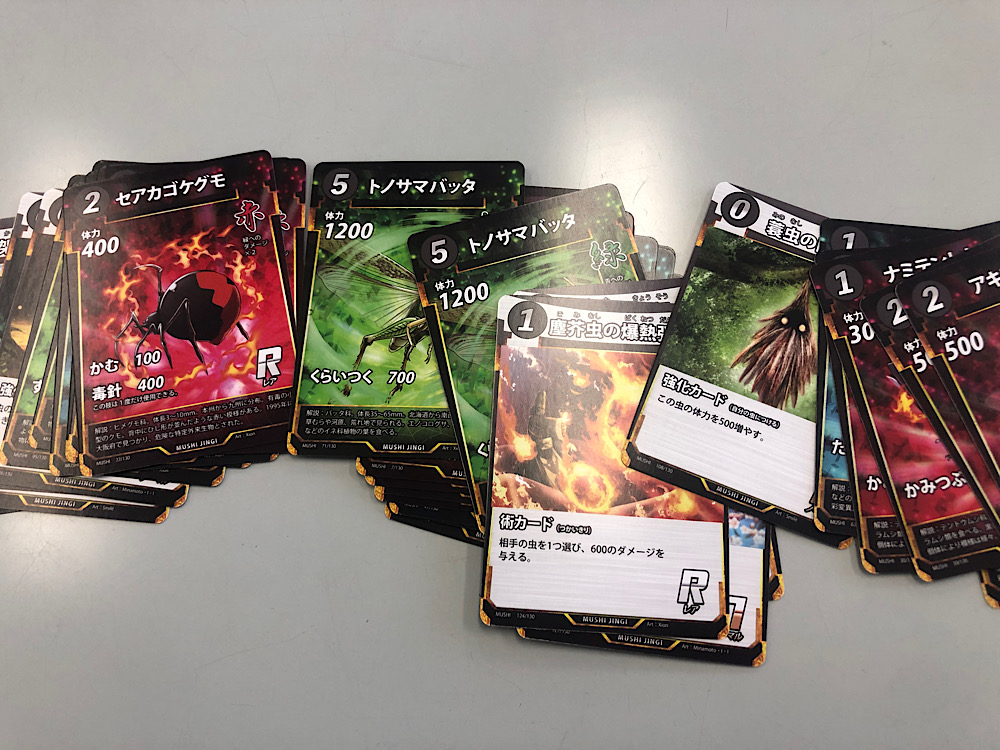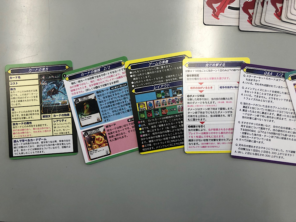 また、体力と攻撃力が分かれてたり、召喚酔いがなかったり、一つのカードの中に技が二つあってそれを選択したり、属性の概念があったり、一体の虫に対して複数体の虫で攻撃できたり……など