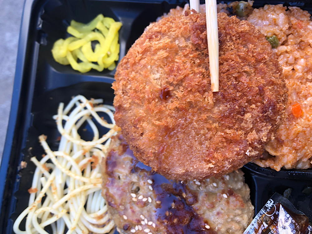 大盛りのチキンライス、ハンバーグ、メンチカツ、おまけのパスタ