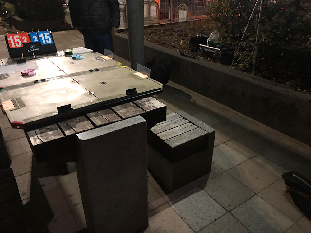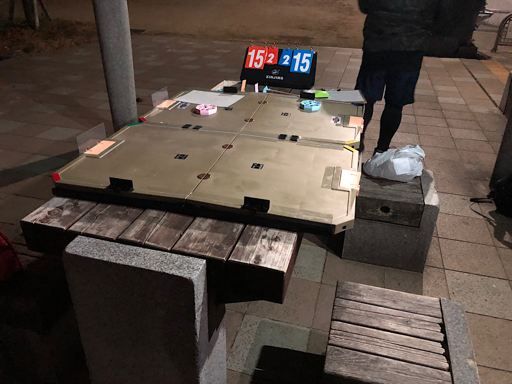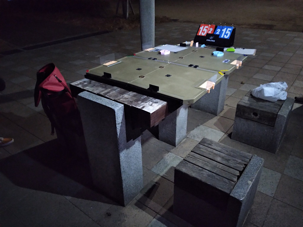 寒空の真夜中、そしてしたらば君さんの腰も考えて地べたではなく机の上でできる公園を見繕って移動