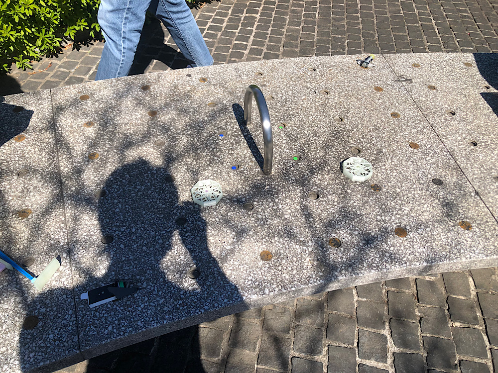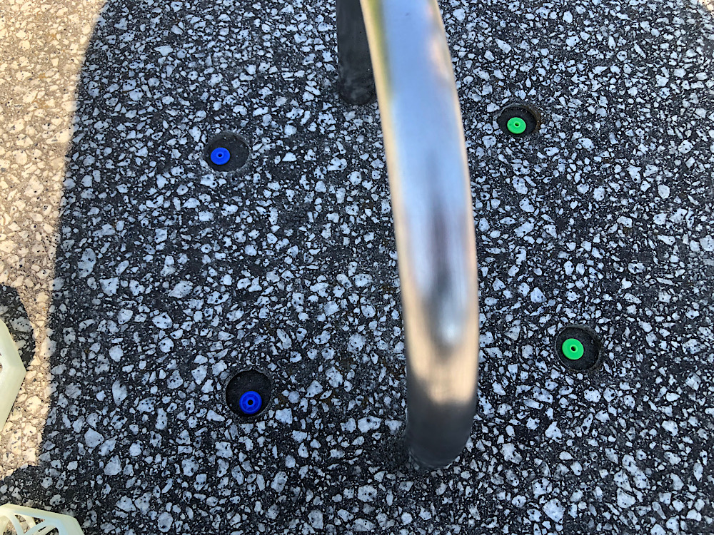 このベンチ、ポツポツと穴が空いてるので、そこにミニ四駆のローラーを入れて目印にしてそこをフリップホールとします