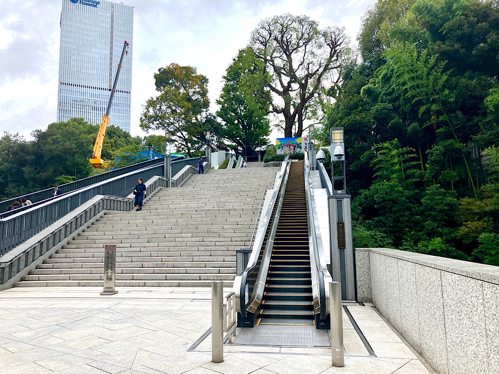 神社の石段の隣にエスカレーターがあるのはとても不思議な感じですが