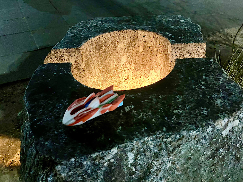 ライトアップされた穴の空いた岩