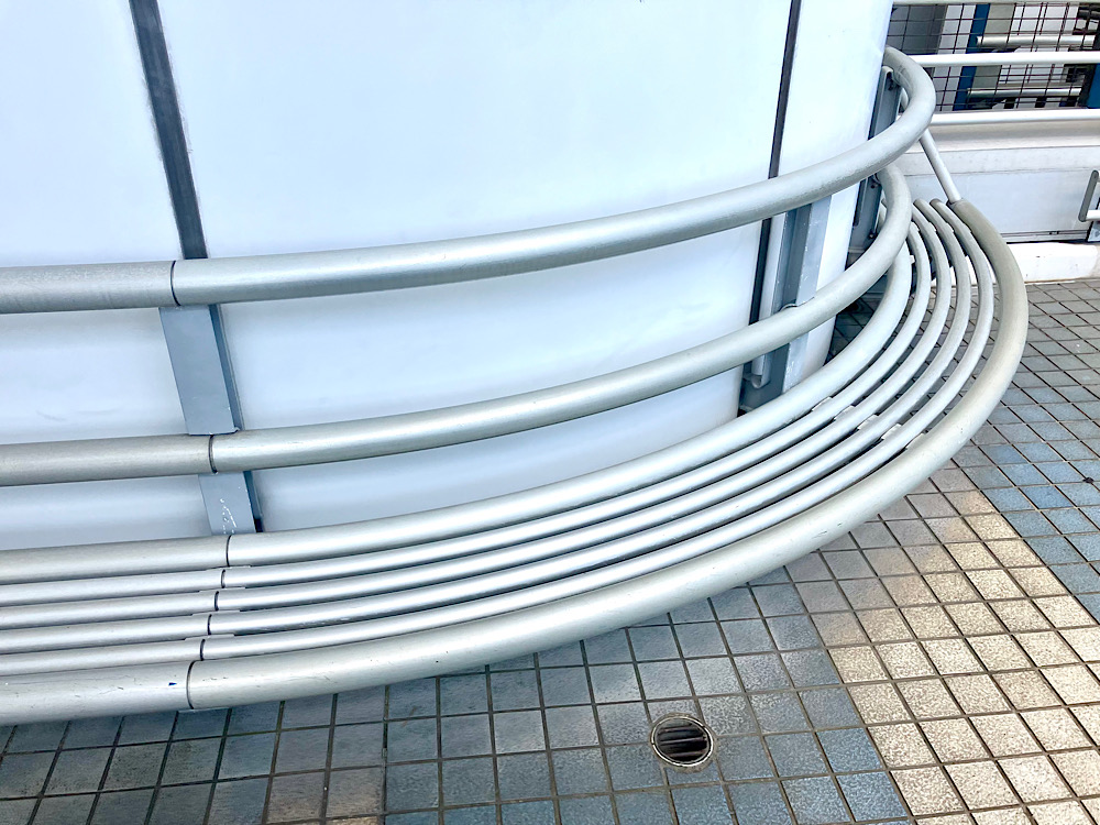 レインボーブリッジに存在する半円状のパイプが並んだベンチ