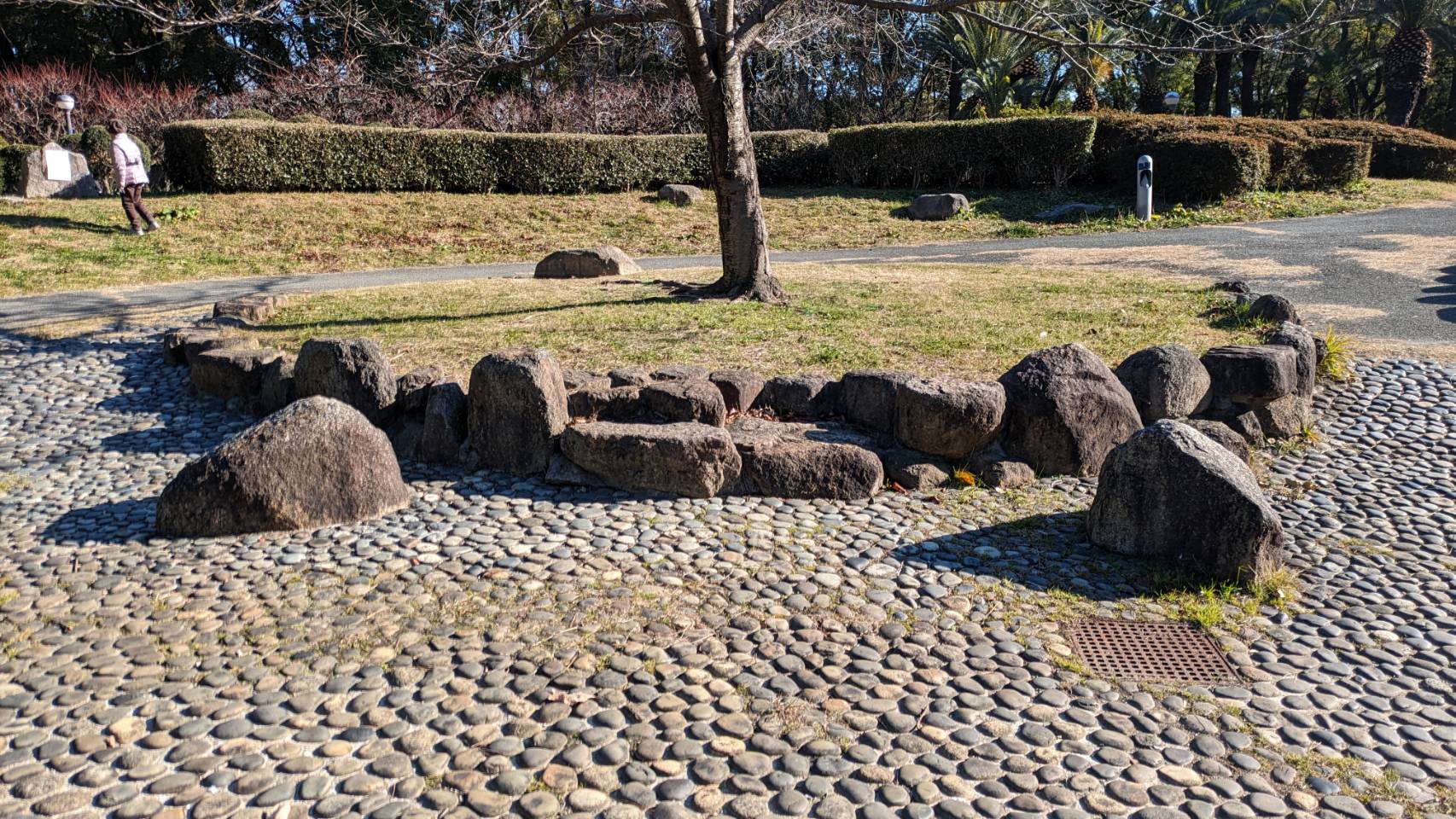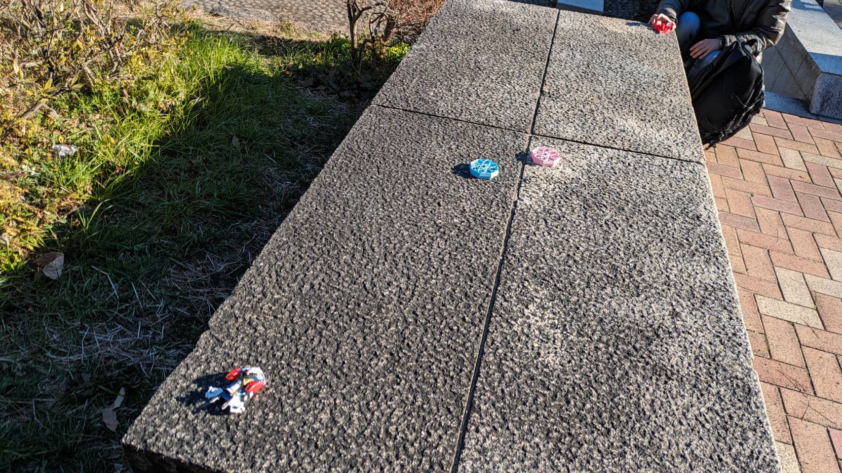 花壇の周りの飛び石をコースにしてのレース