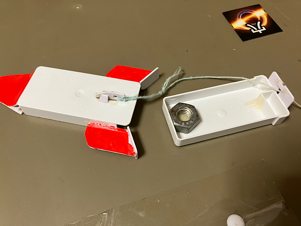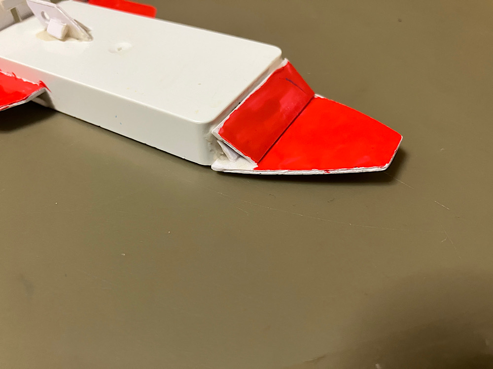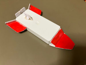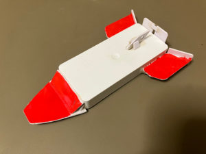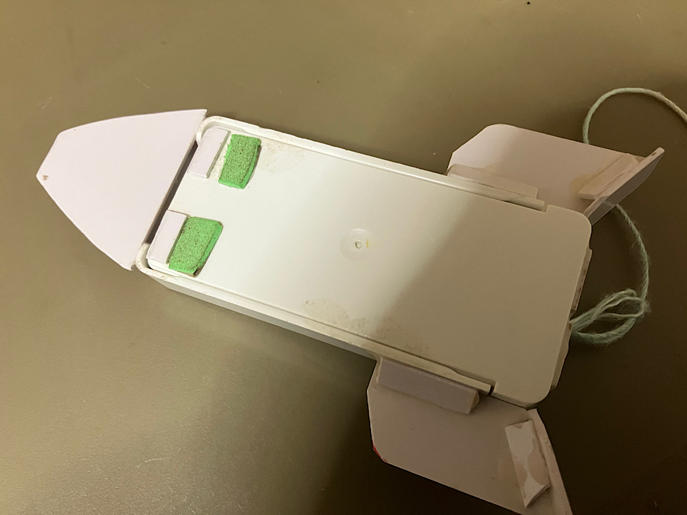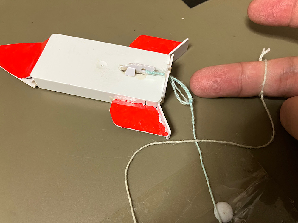 また、ボディに結わい付けた紐をシュートポイントの穴に通す事で引き戻し時に機体が前を向きやすくするだけでなく