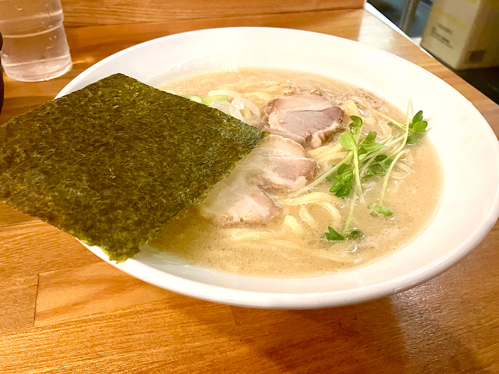 濃厚な豚骨スープに、カイワレなどのオシャレな具材