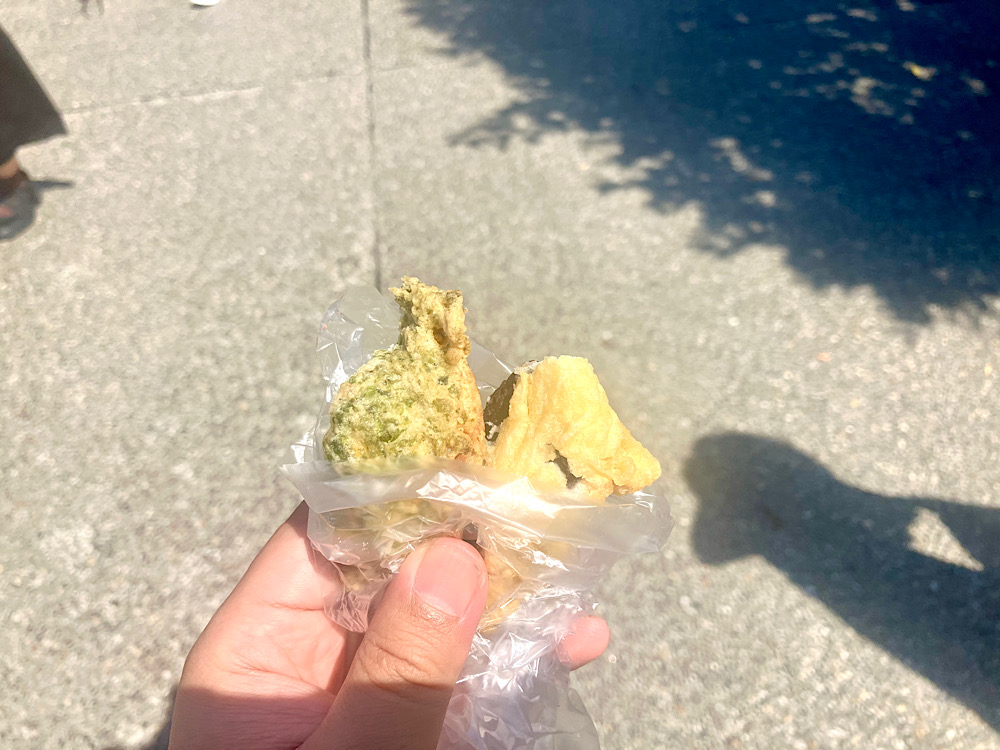 それぞれノーマルの揚げまんじゅうともんじゃ揚げまんじゅうを買ってシェアしました