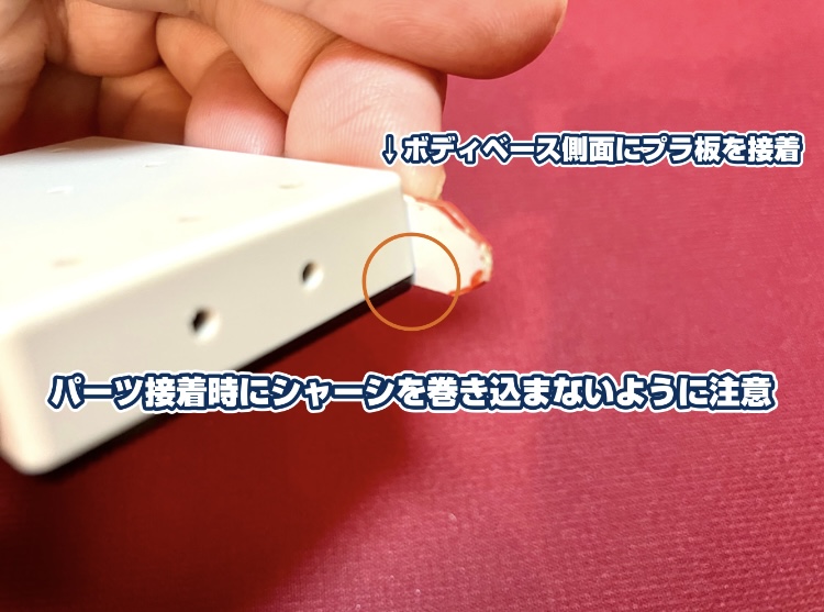 ベースの側面にパーツを接着する際、接着剤の液漏れ等でシャーシまで巻き込んで接着しないよう注意してください