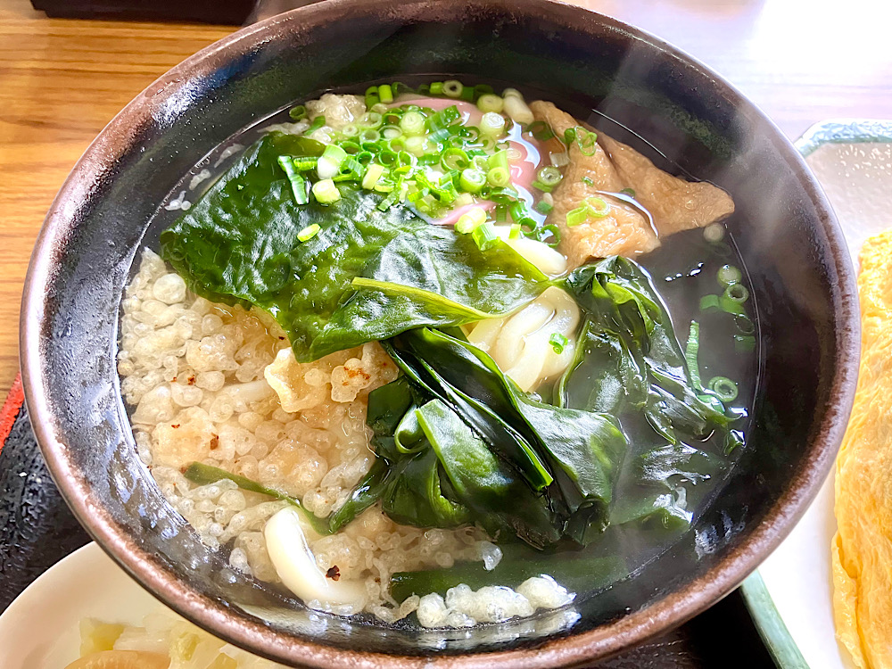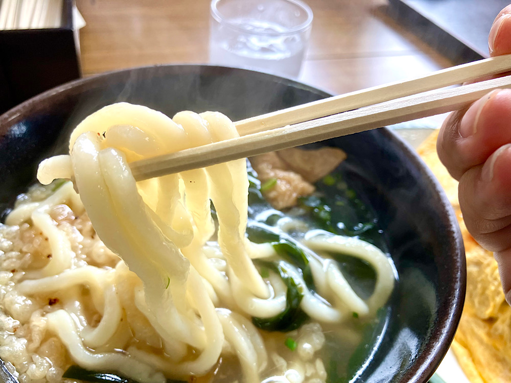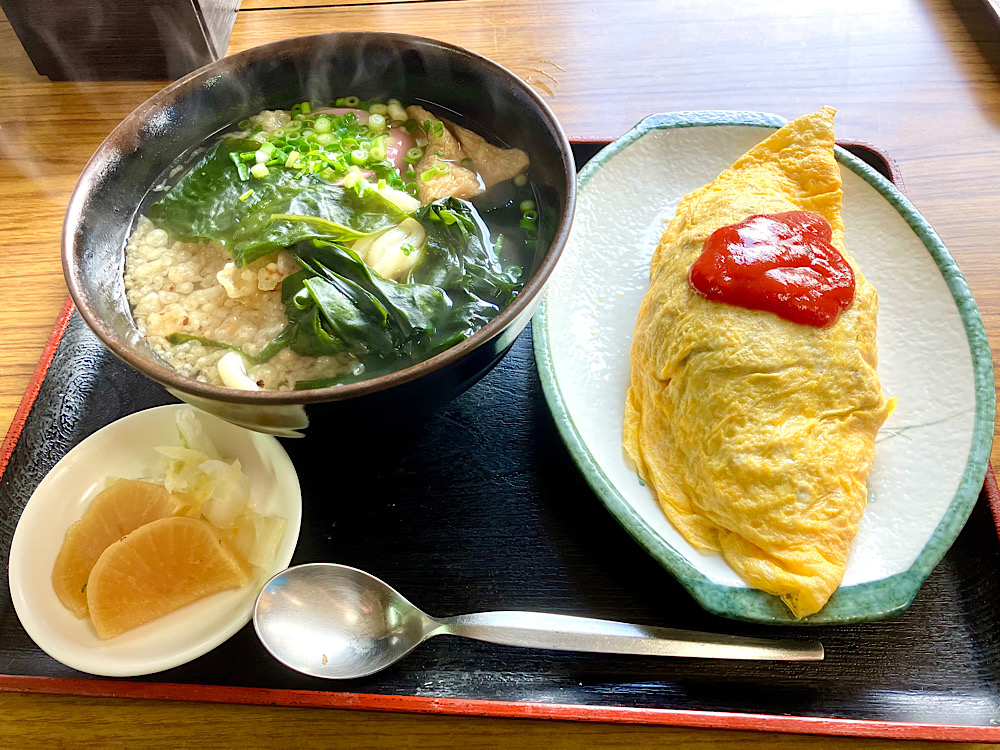 大きな器になみなみと注ぎ込まれたうどんにふわふわトロトロのオムライス