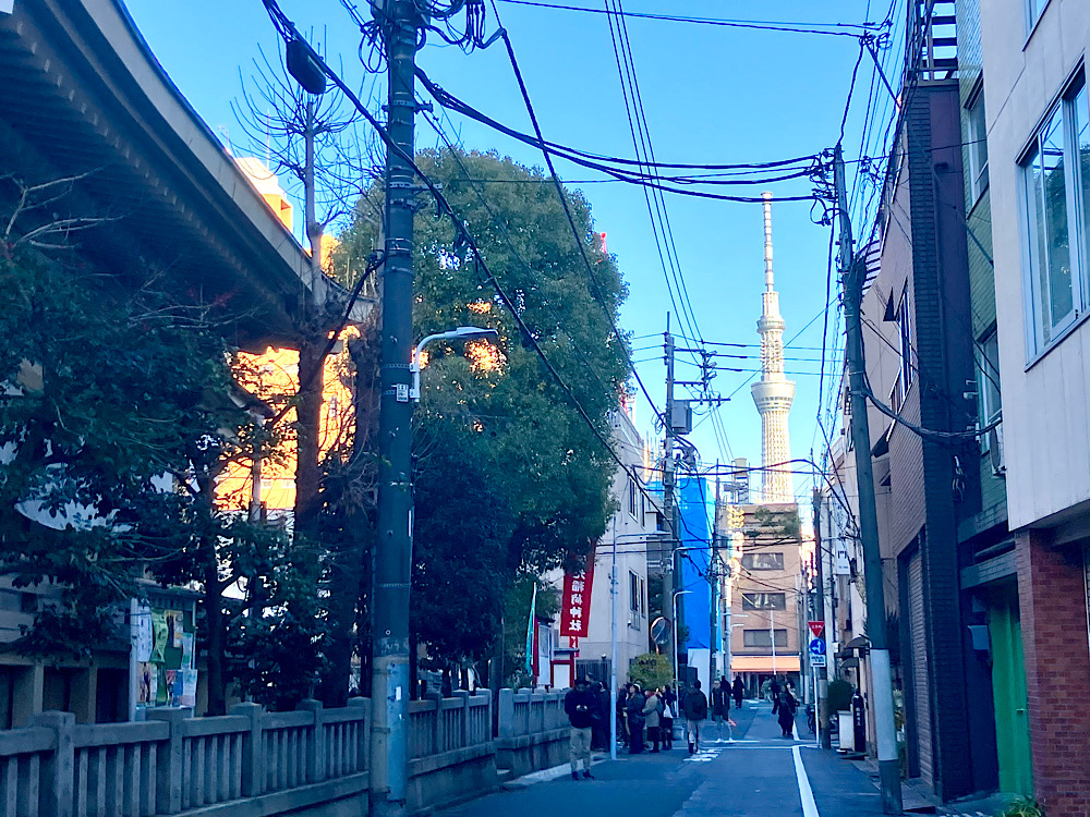 神社犇く住宅地の路地から覗けるスカイツリーってのもなんか不思議な景色です