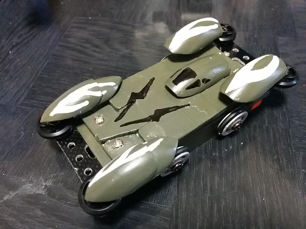 ちーこさん製フリックス 『ルドルフJr.』 コメントを残す Tweet Pocket ミニ四レーサー、ちーこさんのフリックスが完成した! その名も『ルドルフJr.』 モチーフは、蠍&ミニ四駆。それらしく、フロントとリアにはローラーが付いており、サイドにはタイヤらしきローラーが(ノーマルシャーシと同じかそれ以上の高さです) 流線型なボディは空力性能が高く、機動力を重視した機体と言える そして、なぜ『Jr.』なのかと言えば こう言う事だ! 既にミニ四駆で同じデザインのマシンを作っていたからなのだ! RCカーのボディをミニ四駆化した時に『Jr.』って付けるのと同じ方式だね
