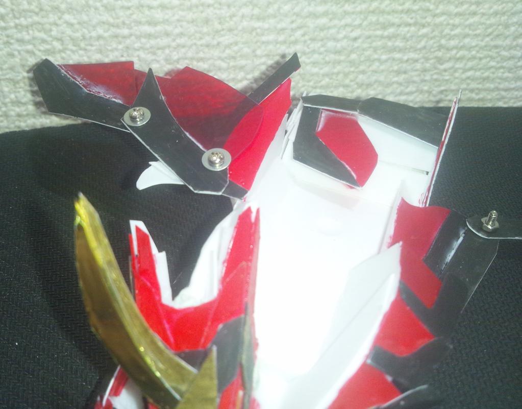 左肩は武士の肩をヒントにした多段式の鎧!生半可な攻撃はこの装甲の前に受け流される!