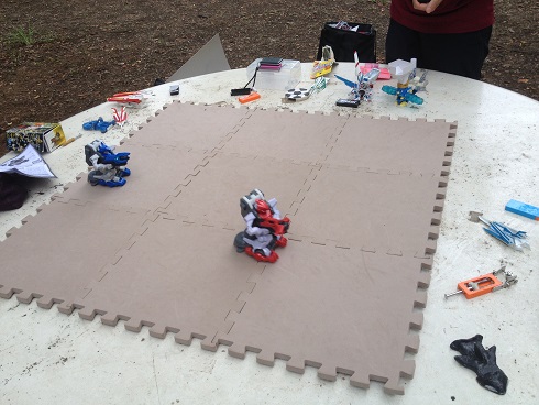 丸テーブルの上だと落下が怖いけど、丸テーブルの上に置いたジョイントマットの上でやれば、機体がジョイントマットの外に出ると『コテン』と優しく倒れるのでテーブルから落ちる心配なし