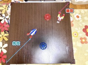 次に、フリップマインをフィールド上の好きな位置にセット(お互いに相手より後に置きたがる等でなかなか置く位置が決められない場合は同時に投げ入れる)